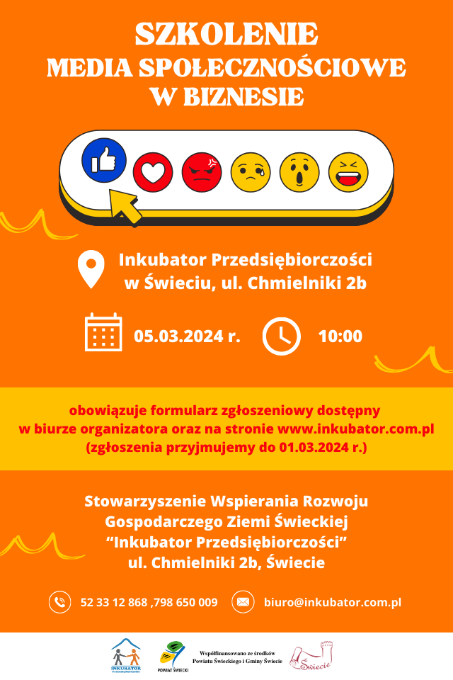 Inkubator Przedsiębiorczości w Świeciu zaprasza wszystkich zainteresowanych do udziału w bezpłatnym szkoleniu pt. „Media społecznościowe w Biznesie” współfinansowanym ze środków Powiatu Świeckiego i Gminy Świecie.