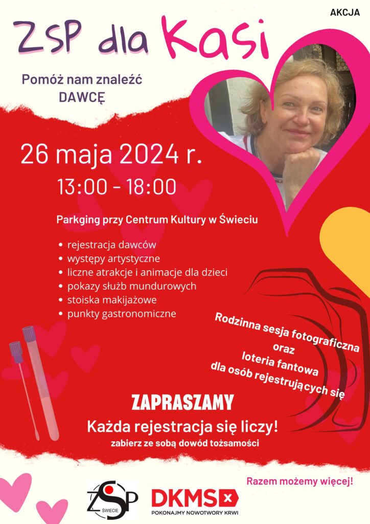 Zapraszamy na akcję zbiórki potencjalnych dawców szpiku kostnego organizowanego dla nauczycielki ZSP w Świeciu – Pani Katarzyny Popiołek – Staniszewskiej.