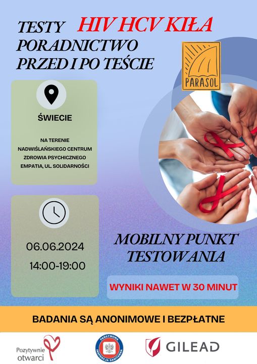 6️ czerwca br. w siedzibie Nadwiślańskiego Centrum Zdrowia Psychicznego EMPATIA przy Wojewódzkim Szpitalu dla Nerwowo i Psychicznie Chorych im. dr. J.Bednarza  w Świeciu otwarty będzie punkt testowania  w kierunku zakażeń HIV,HCV i kiły. Przed i po  badaniach będzie profesjonalne poradnictwo.