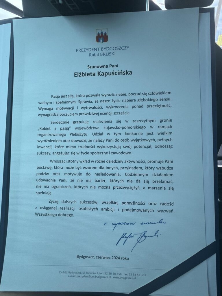 Z pełnym przekonaniem uważamy, że Pani Elżbieta Kapuścińska zasłużyła na wyróżnienie w plebiscycie „Kobiety z pasją”.
