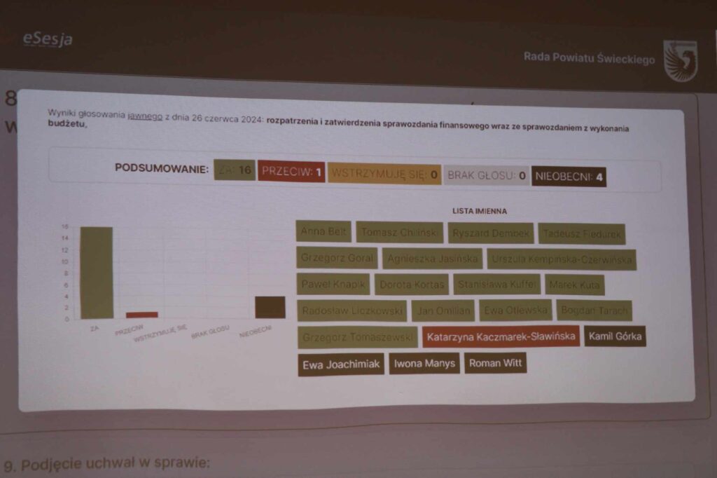 Absolutorium dla Zarządu Powiatu Świeckiego to z kolei konsekwencja zaaprobowania przez radnych sprawozdania finansowego wraz ze sprawozdaniem z wykonania budżetu za rok 2023 oraz informacji o stanie mienia Powiatu. Pozytywną opinię w tym zakresie wydała także Regionalna Izba Obrachunkowa oraz Komisja Rewizyjna Rady Powiatu.
