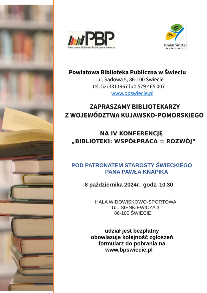 Serdecznie zapraszamy bibliotekarzy do udziału w IV Konferencji dla bibliotekarzy „Biblioteki: współpraca=rozwój”, która odbędzie się 8 października 2024r. w godz. 10.30-13.45. Udział jest bezpłatny. Wydarzenie odbędzie się pod patronatem Starosty Świeckiego Pana Pawła Knapika.