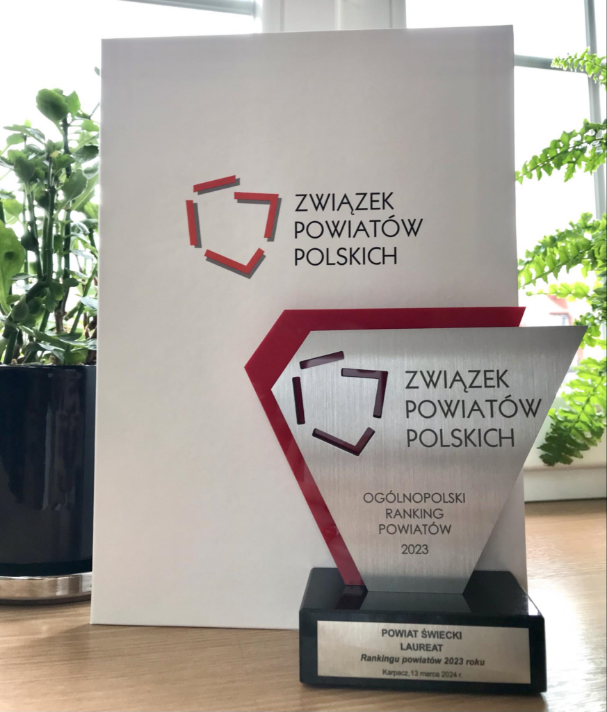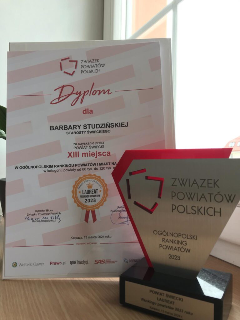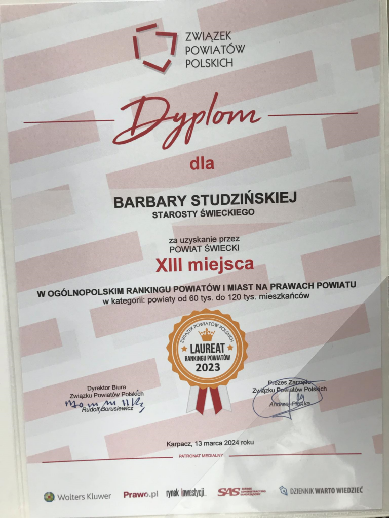 Mamy zaszczyt poinformować, że w zakończonej edycji, prowadzonego przez Związek Powiatów Polskich Ogólnopolskiego Rankingu Powiatów 2023, w kategorii „powiaty od 60 do 120 tys. mieszkańców” zarządzana przez Panią Starostę jednostka znalazła się w gronie laureatów – zajmując 13 miejsce.